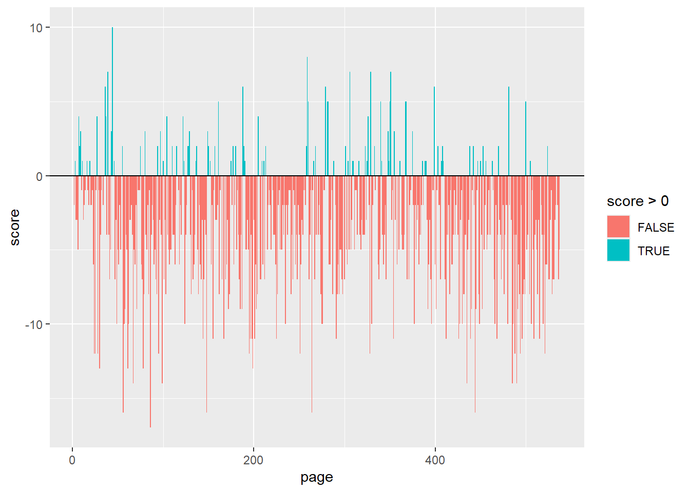 ##To visualize how sentiment changed over time, I made a bar graph. ggplot(tw1_sentiment_score, aes(x = page, y = score, fill = score >0)) +geom_col() +geom_hline(yintercept =0)